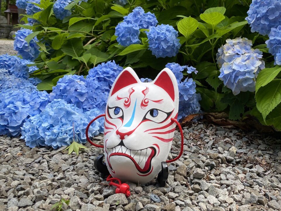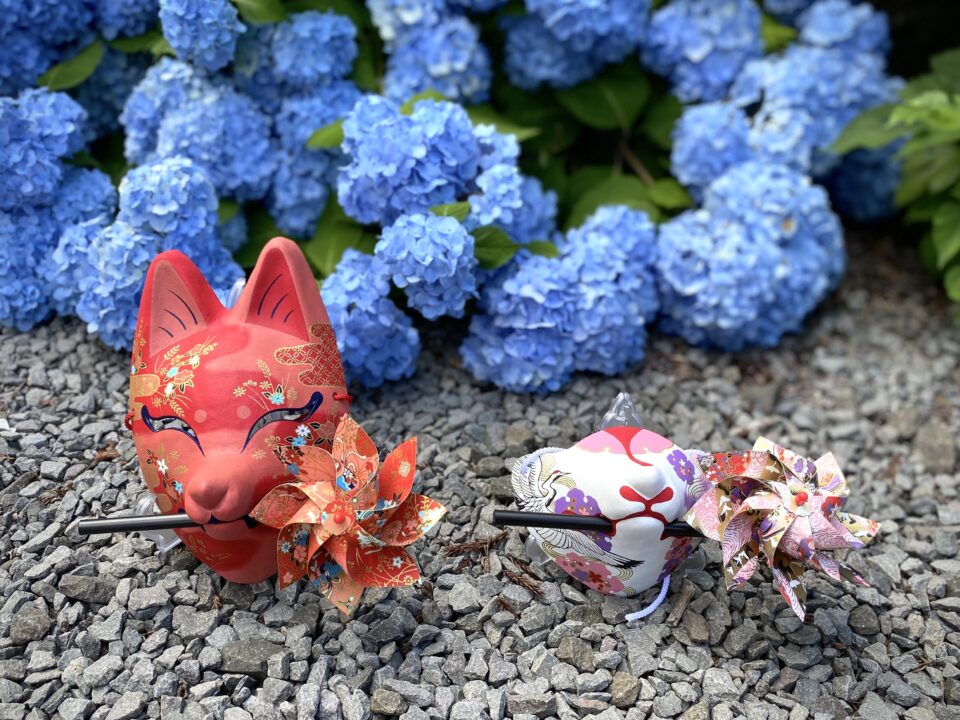 風車の咥えた狐面と、ねぶた風狐面。