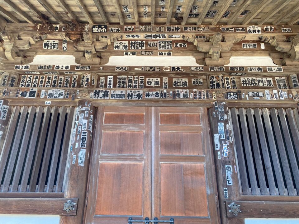 至る所にお名前シールが。これは千社札といい「お参りしましたよー」という意味合いで自分の名前や住所を貼ったものです。