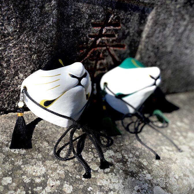 | 注意事項 | ・日焼けをしてしまう場合がございますので長時間の直射日光はお控えください。 ・水に当たってしまうと絵付けが滲んだり、お面の強度が弱くなる可能性があります。 ・湿度が高く換気がされていない状態が続くとカビが生える場合がございます。 |