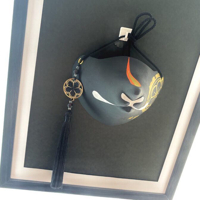 | 注意事項 | ・日焼けをしてしまう場合がございますので長時間の直射日光はお控えください。 ・水に当たってしまうと絵付けが滲んだり、お面の強度が弱くなる可能性があります。 ・湿度が高く換気がされていない状態が続くとカビが生える場合がございます。 |
