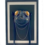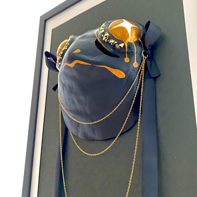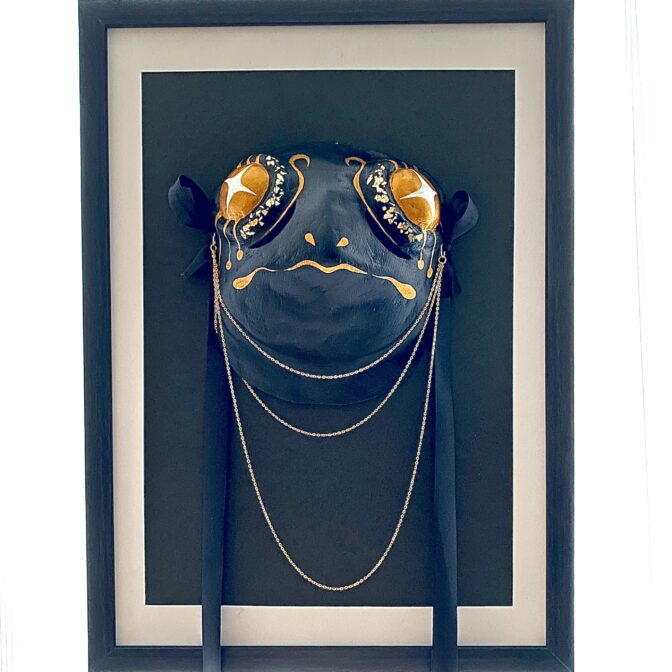ぎらりと光る目元と揺れるりぼんが怪しげな蛙面です。